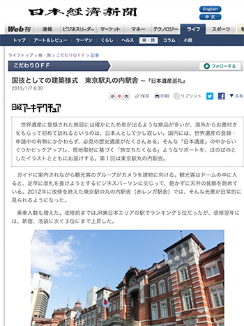 「国技としての建築様式 東京駅丸の内駅舎 ~『日本遺産巡礼』」という磯達雄氏、宮沢洋氏による記事が、日本経済新聞に掲載されています。