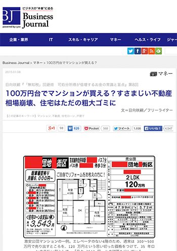 ●ニュースコラムと建築本日向咲嗣氏(フリーライター)による記事「100万円台でマンションが買える?すさまじい不動産相場崩壊、住宅はただの粗大ゴミに」が、ビジネスジャーナルに掲載されています。