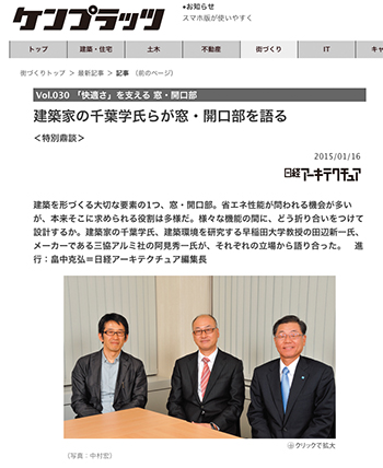 建築家の千葉学氏、早稲田大学教授の田辺新一氏、三協アルミ社の阿見秀一氏による鼎談記事「建築家の千葉学氏らが窓・開口部を語る」が、ケンプラッツに掲載されています。