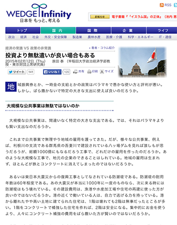 ●ニュースコラムと建築本原田泰氏(早稲田大学政治経済学部教授・東京財団上席研究員)による記事「投資より無駄遣いが良い場合もある」が、WEDGE Infinityに掲載されています。