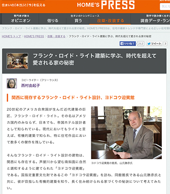 「フランク・ロイド・ライト建築に学ぶ、時代を超えて愛される家の秘密」というヨドコウ迎賓館の館長の山元勝彦氏に話を聞いている記事が、HOME’S PRESSに掲載されています。