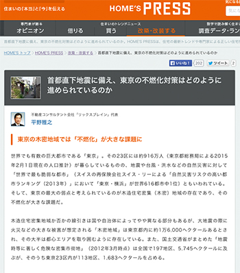 「首都直下地震に備え、東京の不燃化対策はどのように進められているのか 」という平野雅之氏(不動産コンサルタント会社「リックスブレイン」代表)による記事が、HOME’S PRESSに掲載されています。