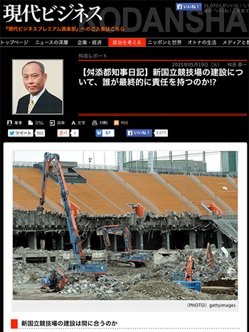 ●ニュースコラムと建築本「【舛添都知事日記】新国立競技場の建設について、誰が最終的に責任を持つのか!?」という舛添都知事による記事が、現代ビジネスに掲載されています。