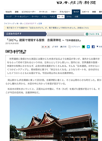 磯達雄氏、宮沢洋氏による日経アーキテクチュア『旅行が楽しくなる 日本遺産巡礼 西日本30選』を基に再構成した記事「「コピペ」建築で増殖する屋根 吉備津神社 ~『日本遺産巡礼』 」が、日本経済新聞に掲載されています。