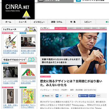 デザイナーの吉岡徳仁氏へのインタビュー記事「歴史に残るデザインとは?吉岡徳仁が辿り着いた、みえないかたち 」が、CINRA.NETに掲載されています。