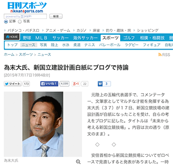 新国立競技場問題に関する記事「為末大氏、新国立建設計画白紙にブログで持論」が、日刊スポーツに掲載されています。
