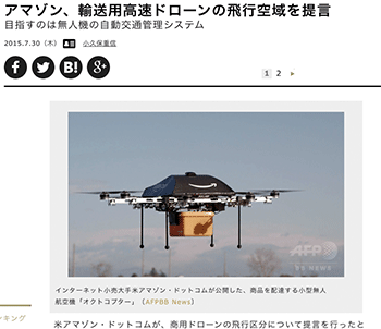 「アマゾン、輸送用高速ドローンの飛行空域を提言 目指すのは無人機の自動交通管理システム」というドローン関連の記事が、 JBpressに掲載されています。