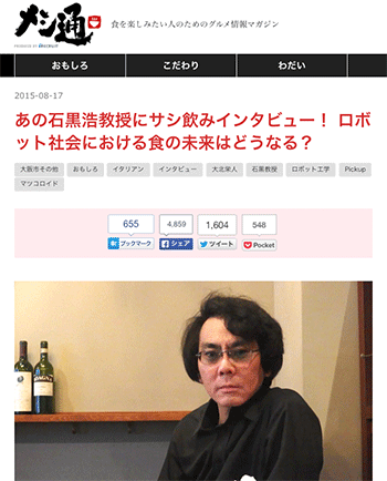 「あの石黒浩教授にサシ飲みインタビュー! ロボット社会における食の未来はどうなる?」というグルメサイト「メシ通」がロボット研究者の石黒浩氏にインタビューしている記事が、メシ通に掲載されています。