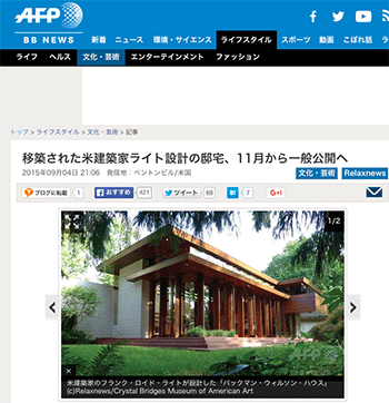 アメリカの建築家フランク・ロイド・ライトが1950年代に設計したアメリカ、ニュージャージー州の邸宅が、アーカンソー州のクリスタル・ブリッジズ米国美術館に移築され、11月11日から一般に公開されることになったそうです。