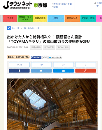 「出かけた人から絶賛相次ぐ! 隈研吾さん設計「TOYAMAキラリ」の富山市ガラス美術館が凄い」という隈研吾さ氏が設計した「富山市ガラス美術館」を紹介している記事が、タウンネットに掲載されています。