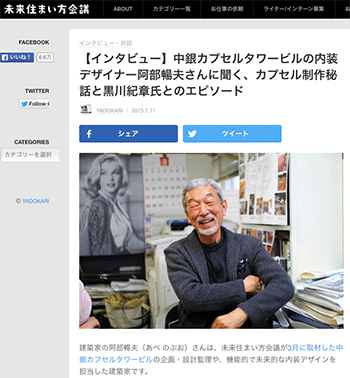 「【インタビュー】中銀カプセルタワービルの内装デザイナー阿部暢夫さんに聞く、カプセル制作秘話と黒川紀章氏とのエピソード」という記事が、未来住まい方会議に掲載されています。