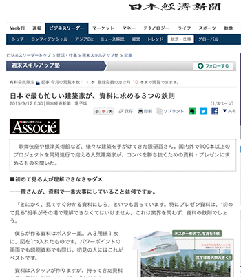 「日本で最も忙しい建築家が、資料に求める3つの鉄則 」という建築家の隈研吾氏に話をきいている記事が、日本経済新聞に掲載されています。