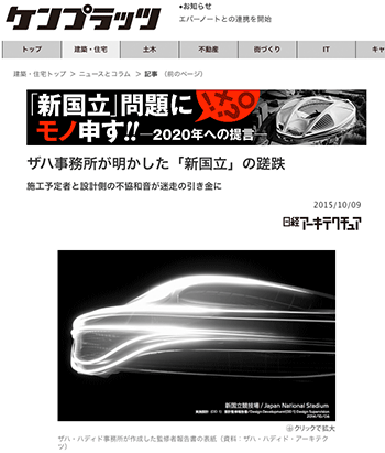 建築「ザハ事務所が明かした「新国立」の蹉跌 施工予定者と設計側の不協和音が迷走の引き金に 」という新国立競技場問題に関する記事が、ケンプラッツに掲載されています。