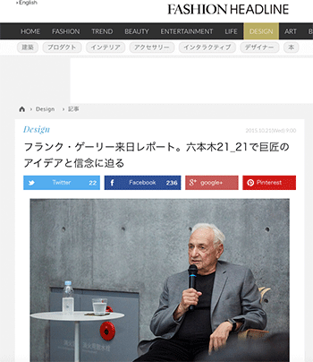 「フランク・ゲーリー来日レポート。六本木21_21で巨匠のアイデアと信念に迫る」という六本木の21_21 DESIGN SIGHTで開催中の展覧会「建築家 フランク・ゲーリー展 “I Have an Idea”」に関する記事が、FASHION HEADLINEにて公開されています。