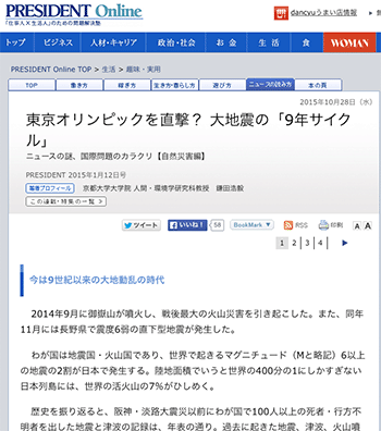都市防災「東京オリンピックを直撃? 大地震の「9年サイクル」」という京都大学大学院 人間・環境学研究科教授に鎌田浩毅氏による記事が、PRESIDENT Onlineに掲載されています。