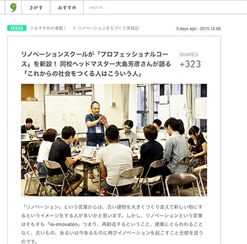 →『リノベーションスクールが「プロフェッショナルコース」を新設! 同校ヘッドマスター大島芳彦さんが語る「これからの社会をつくる人はこういう人」』