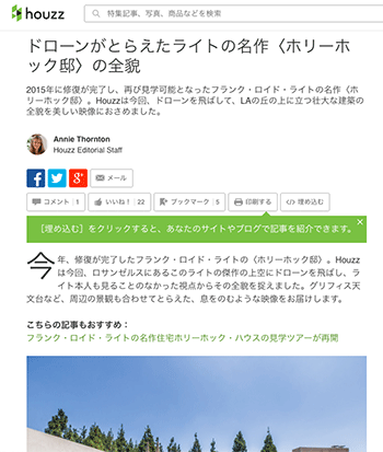 建築2015年に修復が完了し、再び見学可能となったフランク・ロイド・ライトによる「ホリーホック邸」を紹介、映像におさめている記事がhouzzに掲載されています。