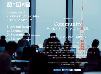 「「余白」という“リアル”・エステート /いま都市を考えるために必要な4つのパースペクティヴ 「2.Community」」という林厚見氏(東京R不動産ディレクター/株式会社スピーク共同代表)、ティム・トンプキンズ 氏(タイムズスクエア・アライアンス代表)の対談記事が、WIRED.jpに掲載されています。