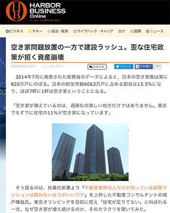 「空き家問題放置の一方で建設ラッシュ。歪な住宅政策が招く資産崩壊」という城戸輝哉氏(建築・リノベーションプロデューサー、不動産コンサルタント)による記事が、ハーバービジネスオンラインに掲載されています。