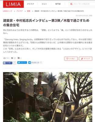 建築建築家の中村拓志氏へのインタビュー記事「木陰で過ごすための集合住宅」が、LIMIAに掲載されています。