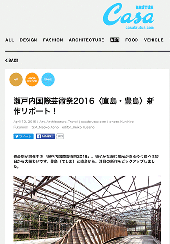 「瀬戸内国際芸術祭2016」での豊島および直島サイトから、注目の新作をピックアップしたという記事がカーサ ブルータスに掲載されています。