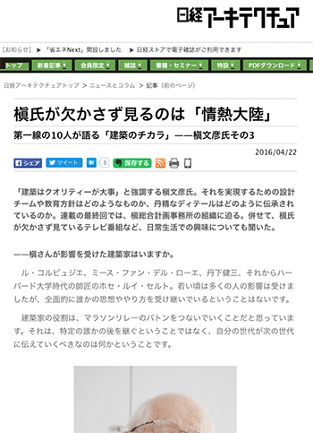 建築家の槇文彦氏へのインタビュー記事が、日経アーキテクチュアに掲載されています。