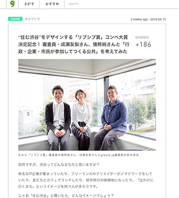 「“住む渋谷”をデザインする「リブシブ賞」コンペ大賞決定記念! 審査員・成瀬友梨さん、猪熊純さんと「行政・企業・市民が参加してつくる公共」を考えてみた」という建築家の成瀬友梨さん、猪熊純さんへのインタビュー記事が、グリーンズに掲載されています。