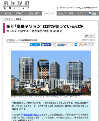 ●ニュースコラムと建築本「駅前「豪華タワマン」は誰が買っているのか」という牧野知弘氏(オラガ総研代表取締役)による記事が、東洋経済オンラインに掲載されています。