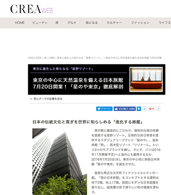 まちづくり東京の千代田区大手町にて20日に開業した「星のや東京」を紹介している記事が、CREA WEBに掲載されています。