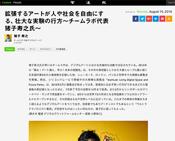 猪子寿之氏へのインタビュー記事「拡張するアートが人や社会を自由にする、壮大な実験の行方~チームラボ代表 猪子寿之氏~」が、電通報に掲載されています。