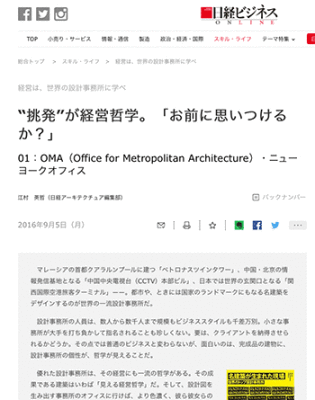オランダの建築家、レム・コールハース氏が率いるOMAのニューヨークオフィスについて取り上げている記事が、日経ビジネスオンラインに掲載されています。