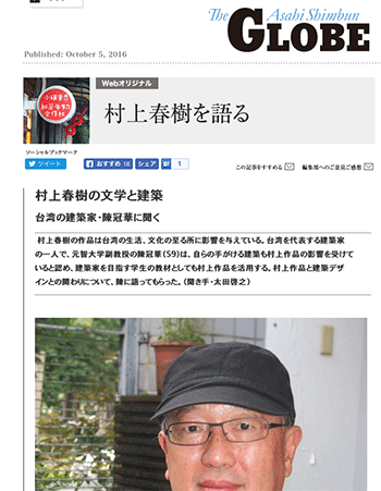 村上作品と建築デザインとの関わりについて、台湾の建築家・陳冠華に話を聞いている記事が、朝日新聞GLOBEに掲載されています。