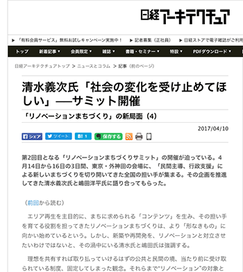 4月14日から16日の3日間、「リノベーションまちづくりサミット」が開催するのにあわせて、関連する内容の対談記事などが、日経アーキテクチュアに掲載されています。