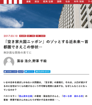 まちづくり「「空き家大国ニッポン」のゾッとする近未来〜首都圏でさえこの惨状…」という藻谷浩介氏と野澤千絵氏による対談記事が、現代ビジネスに掲載されています。