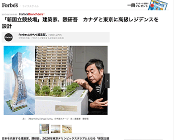 建築隈研吾氏によるカナダでのラグジュアリーレジデンス「Alberni by Kengo Kuma」計画などについて取り上げている記事が、Forbes JAPANに掲載されています。