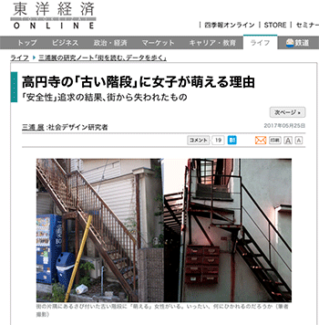 ●ニュースコラムと建築本「高円寺の「古い階段」に女子が萌える理由」という三浦展氏による記事が、東洋経済オンラインに掲載されています。