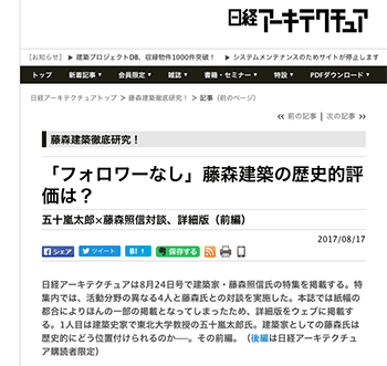 五十嵐太郎氏と藤森照信氏による対談記事が、日経アーキテクチュアに掲載されています。