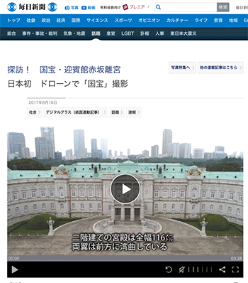 「探訪! 国宝・迎賓館赤坂離宮、日本初 ドローンで「国宝」撮影」という記事と動画が毎日新聞に掲載されています。