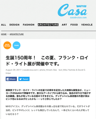 建築グッゲンハイム美術館にて、10月1日まで開催中のフランク・ロイド・ライト展の内容をレポートしている記事が、Casa BRUTUSに掲載されています。