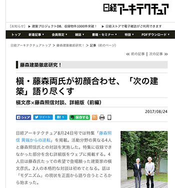 「槇・藤森両氏が初顔合わせ、「次の建築」語り尽くす」という槇文彦氏と藤森照信氏による対談記事が日経アーキテクチュアに掲載されています。
