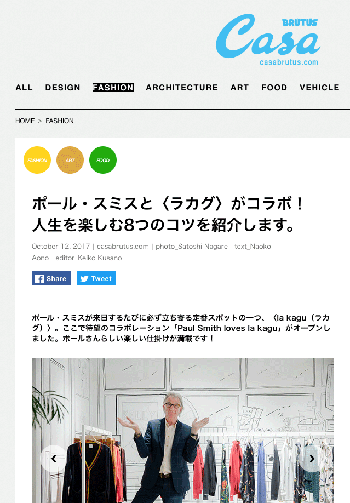 ジャーナル「ポール・スミスと〈ラカグ〉がコラボ! 人生を楽しむ8つのコツを紹介します。」という記事が、 Casa BRUTUSに掲載されています。