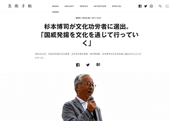 杉本博司が文化功労者に選出。「国威発揚を文化を通じて行っていく」(美術手帖) アート・展覧会 2017.10.262025.11.22 現代美術家の杉本博司氏が文化功労者に選出されたことがわかったそうです。 →『杉本博司が文化功労者に選出。「国威発揚を文化を通じて行っていく」』 https://bijutsutecho.com/news/8513/?