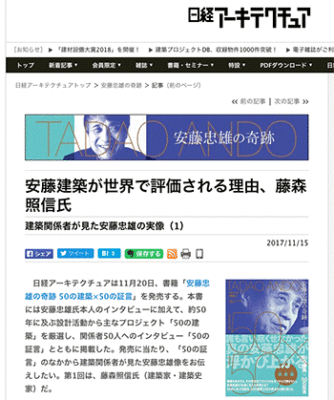 「安藤建築が世界で評価される理由、藤森照信氏 建築関係者が見た安藤忠雄の実像」という藤森照信氏に話を聞いている記事が、日経アーキテクチュアに掲載されています。