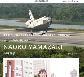 宇宙開発「宇宙飛行士に学ぶ「人生を変える方法」〜理屈を抜くことが重要になる」という山崎直子氏に話を聞いている記事が、MILESTONEに掲載されています。