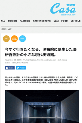 「今すぐ行きたくなる、湯布院に誕生した隈研吾設計の小さな現代美術館。」という隈研吾氏の設計によるCOMICO ART MUSEUM YUFUINについて取り上げている記事が、Casa BRUTUSに掲載されています。