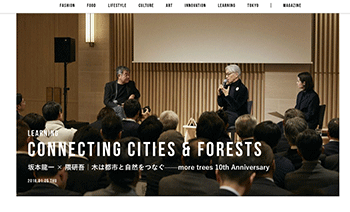 「木は都市と自然をつなぐ——more trees 10th Anniversary 」という2017年12月に森林保全団体more treesの設立10周年を記念して開かれたシンポジウムでの隈研吾氏と坂本龍一氏との対談の模様をレポートしている記事が、HILLS LIFEに掲載されています。
