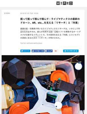 ロボット&ドローン「掘って掘って積んで積んで:ライゾマティクスの最新のドローン、AR、etc…を支える「リサーチ」と「作業」」というライゾマティクスリサーチのメンバーが登壇したRedshift Liveの模様をレポートしている記事が、WIRED.jpに掲載されています。