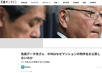 「免震データ改ざん KYBはなぜマンションの物件名を公表しないのか」という牧野知弘氏による記事が、文春オンラインに掲載されています。