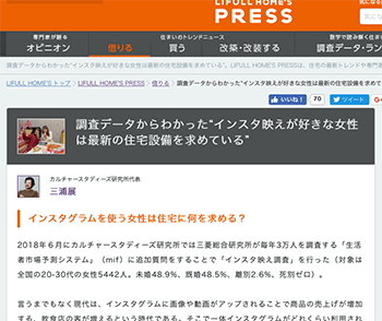 「調査データからわかった“インスタ映えが好きな女性は最新の住宅設備を求めている”」という三浦展氏による記事が、LIFULL HOME’S PRESSに掲載されています。