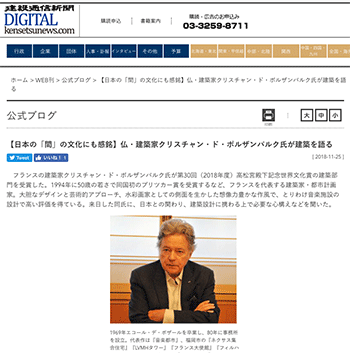 フランスの建築家クリスチャン・ド・ポルザンパルク氏が第30回(2018年度)高松宮殿下記念世界文化賞の建築部門を受賞したことを取り上げている記事が、建設通信新聞Digitalに掲載されています。